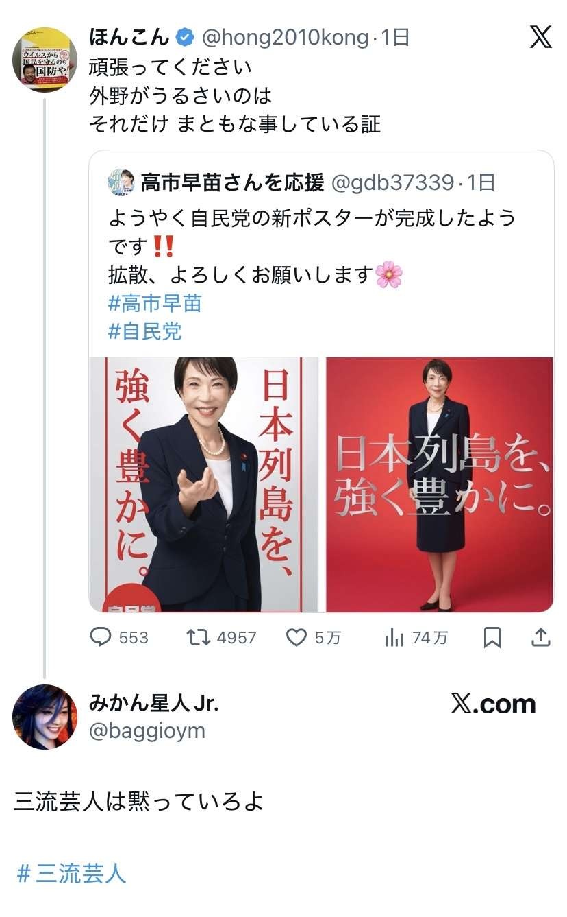 ほんこん「外野がうるさいのは それだけまともな事している証」高市早苗を応援
