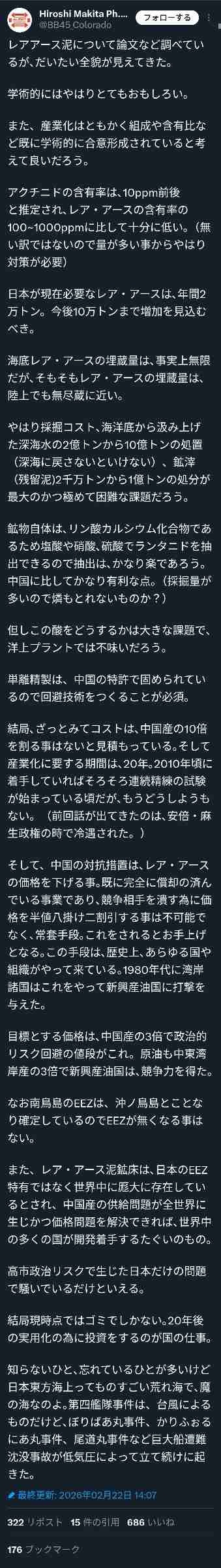 サナはこれで日本がレアアースに困ることはないってゆってたし - 97 : 2026/02/22(日) 19:08:46.88 ID:HveYciHi0