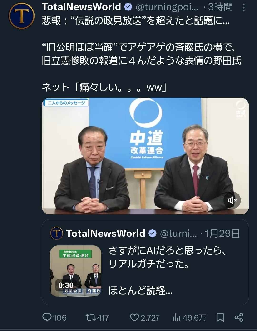 - 小選挙区、比例区ともに「中道」で入れてくれる分にはまだ助かるかもしれん