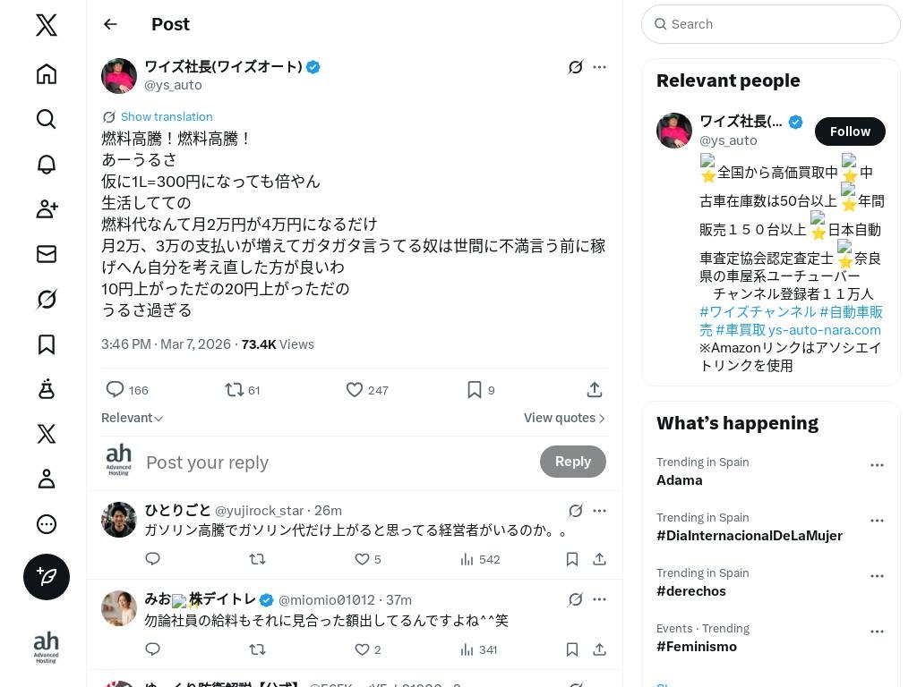 普通の日本人「燃料高騰高騰うるさい。倍でも燃料代月2万が4万になるだけ。世間に不満言う前に稼げん自分を考え直せ」