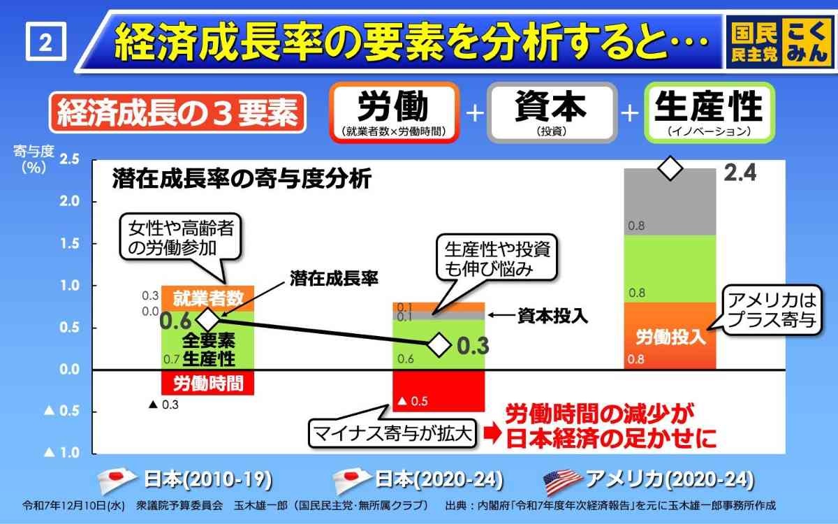 これを要素分解し、潜在成長率2.4%の米国と比較すると、日本が取り組むべき課題が浮き彫りになります。① 労働投入