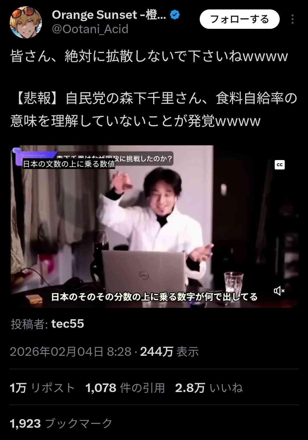 自民党の森下千里さん、食料自給率の意味を理解していないことが発覚www