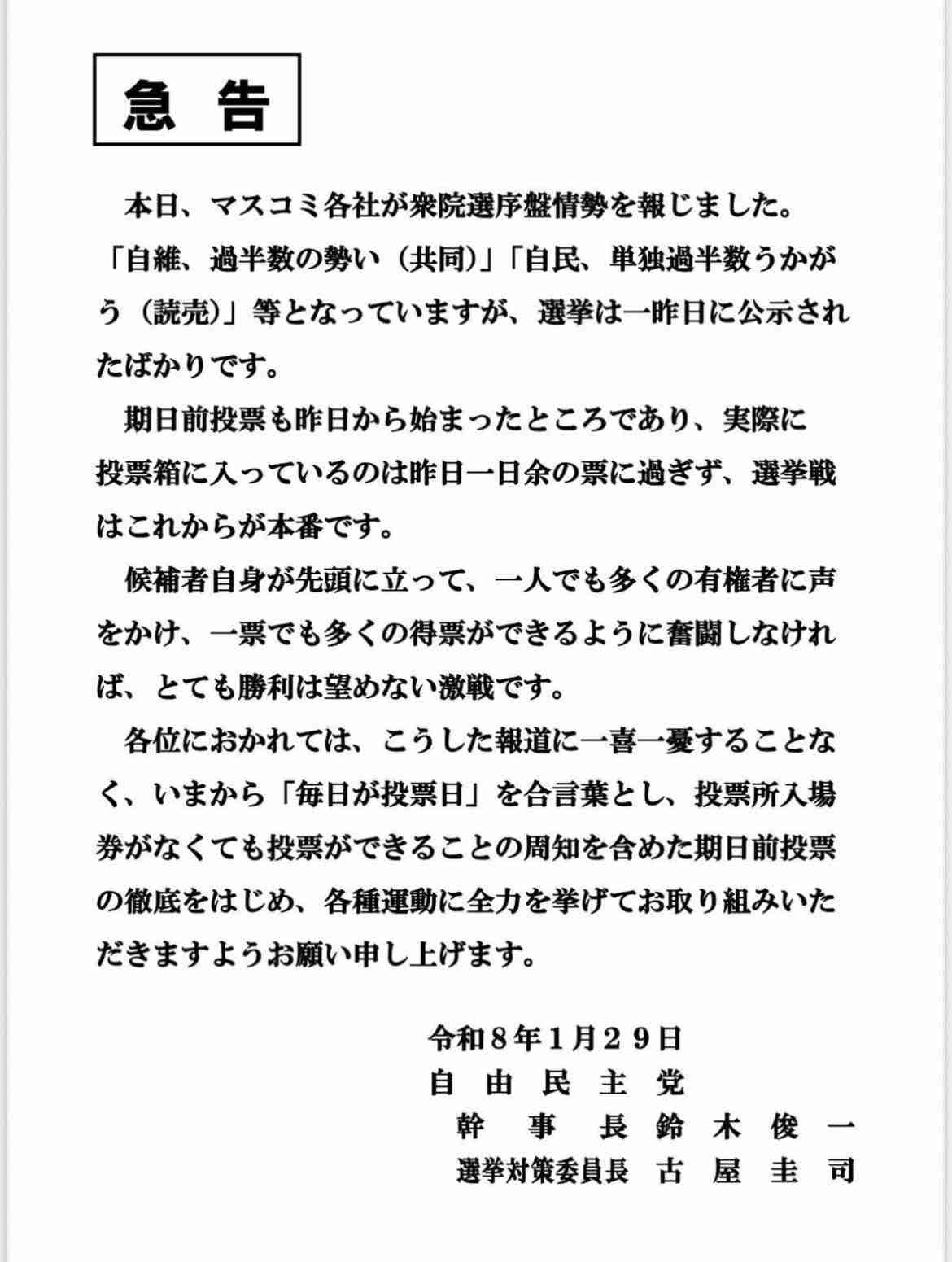 麻生幾 (@ikuaso095) on X私の知り合いの自民党幹部は、昨日から今日にかけての、大手メディアの、自民党は単独過半数、の報道に、喜ぶどころか、怒ってます。 「こんな序盤で、この報道やられたら、無党派層の、潜在的な自民党支持層が、オレが投票しなくても大丈夫だな、と投票にゆかなくなる。極めて重大事態」x.com - 2 : 2026/01/30(金) 14:59:29.06 ID:r8N1hddX0