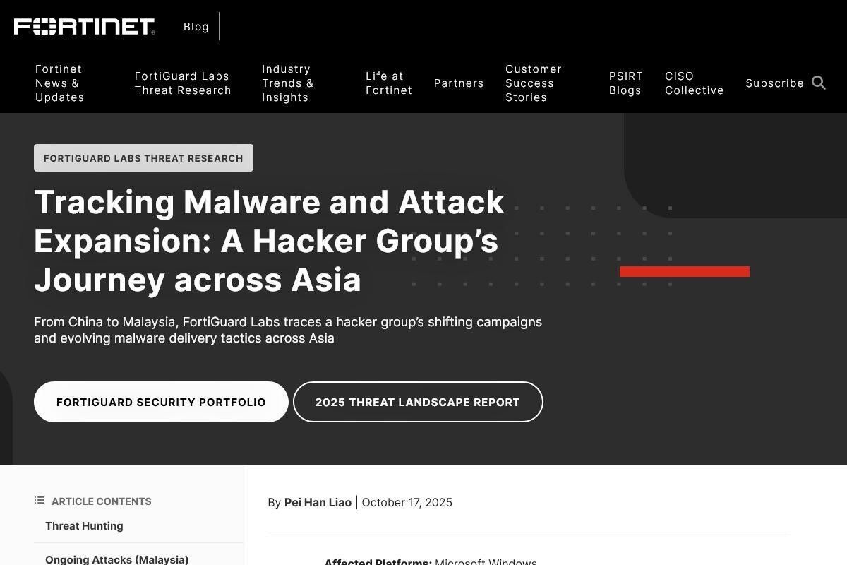 Fortinetは10月17日(米国時間)、「Tracking Malware and Attack Expansion: A Hacker Group’s Journey across Asia|FortiGuard Labs」において、日本を含むアジア全域を標的とするサイバー攻撃キャンペーンを特定したと報じた。