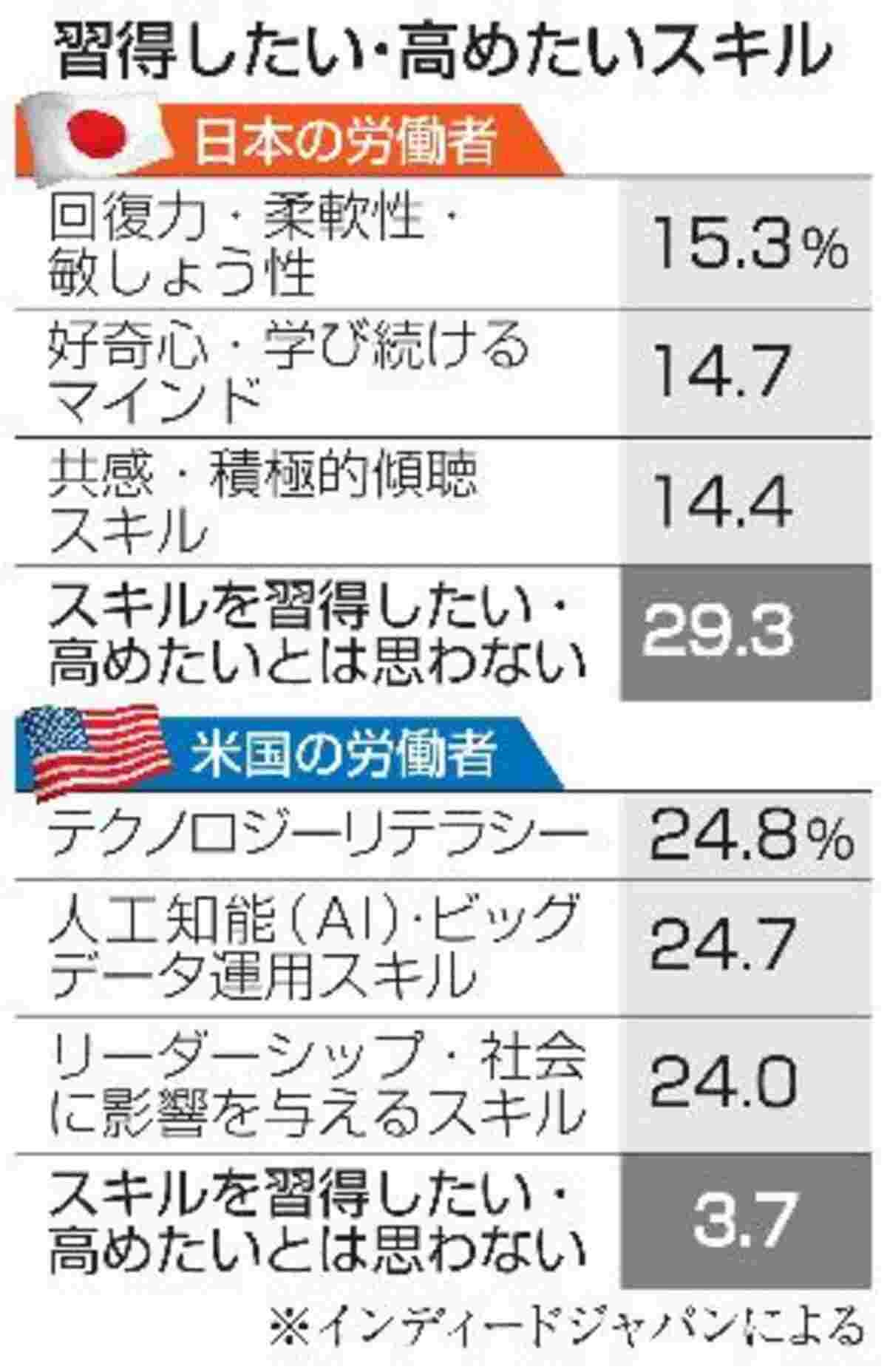 求人検索エンジンを提供するインディードジャパン(東京)は1日までに、日米の労働者が習得したい仕事上のスキルに関する調査結果を公表した。