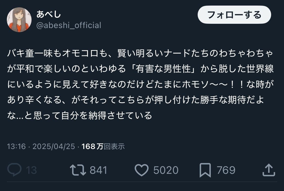 👩「バキ童一味やオモコロのわちゃわちゃが有害な男性性から脱した世界に見えて好きだけどたまにホモソ〜!な時があり辛くなる」