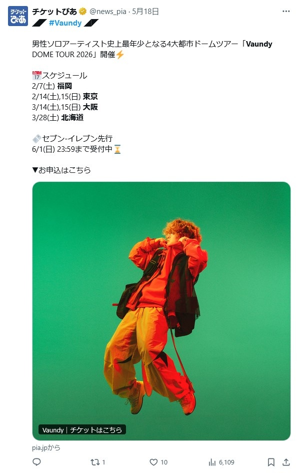 - Vaundy4ドームツアー!←札幌やらんのやろなあ…