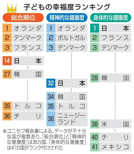 先進国などの子どもの幸福度についてまとめたユニセフ=国連児童基金の報告書が発表され、日本は子どもの身体的な健康が最も高い一方、精神的な幸福度が低く、総合順位は36か国中14位でした。
