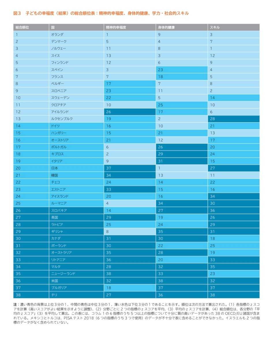 日本は子どもの肥満の割合や死亡率から算出する「身体的健康」が前回と同じく1位で、「スキル」は前回より順位を大きくあげて12位でした。