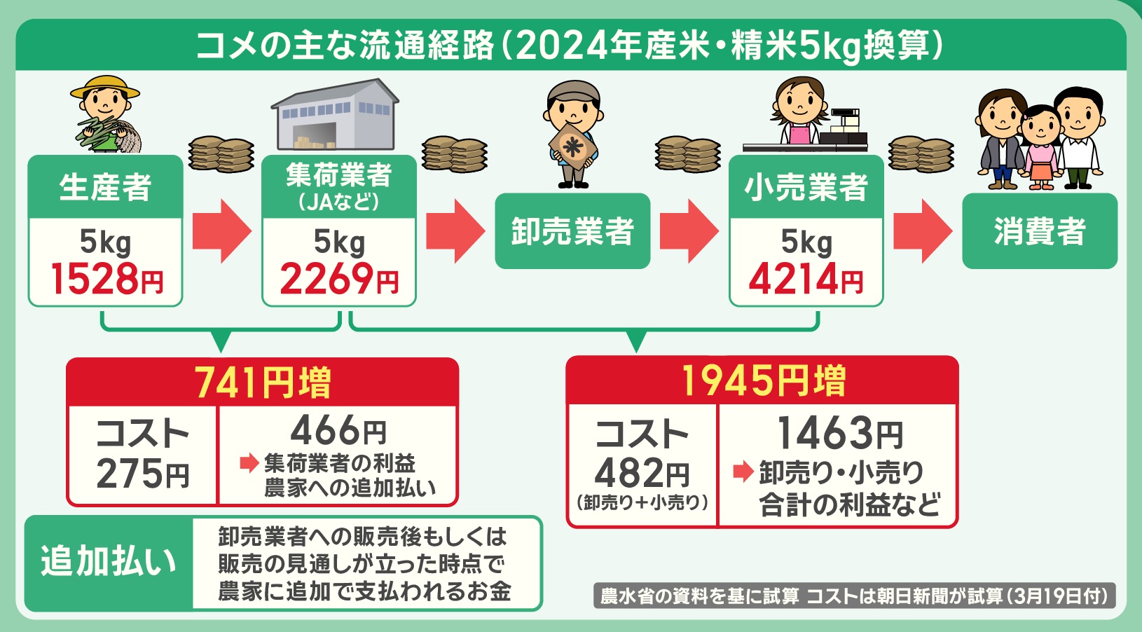 【コメ5kgの流通経路】農家1528円→集荷業者2269円→卸売業者?円→小売業者4212円→消費者