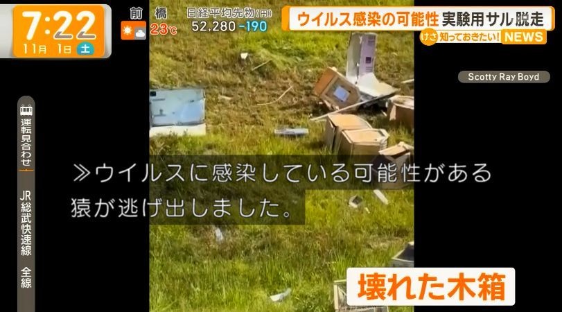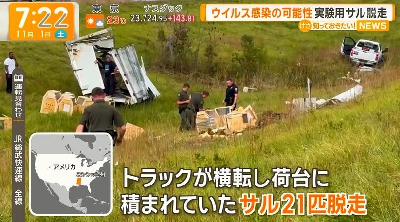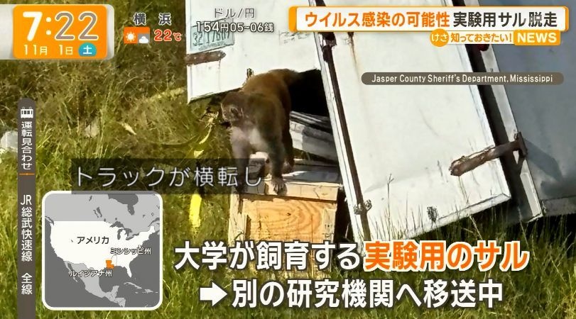 【世界終了】ミシシッピ州でトラックの横転事故、ウイルス研究に使用していたサルが脱走し現在も1匹行方不明www