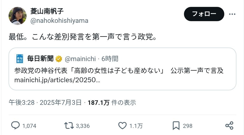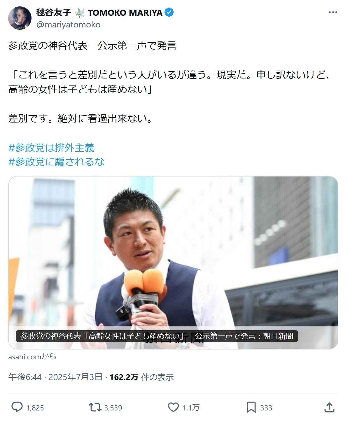 【参政党】神谷宗幣「残念ながら、高齢の女性は子供が生めない」この事実を言っただけで、フェミが鬼のようにキレる
