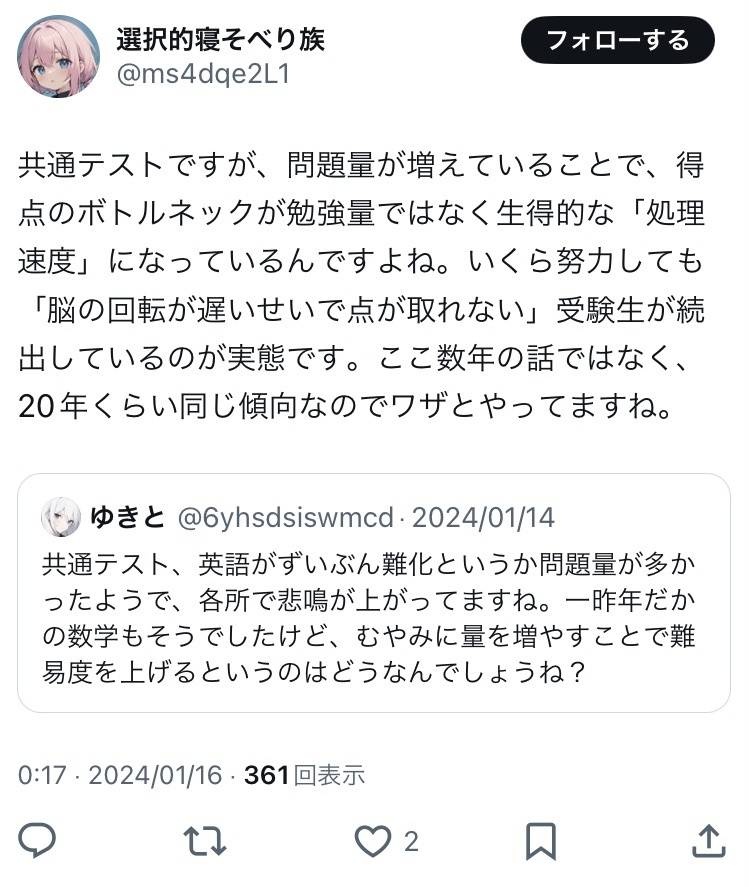 - 有識者「共通テストは処理速度ゲーの知能テスト」
