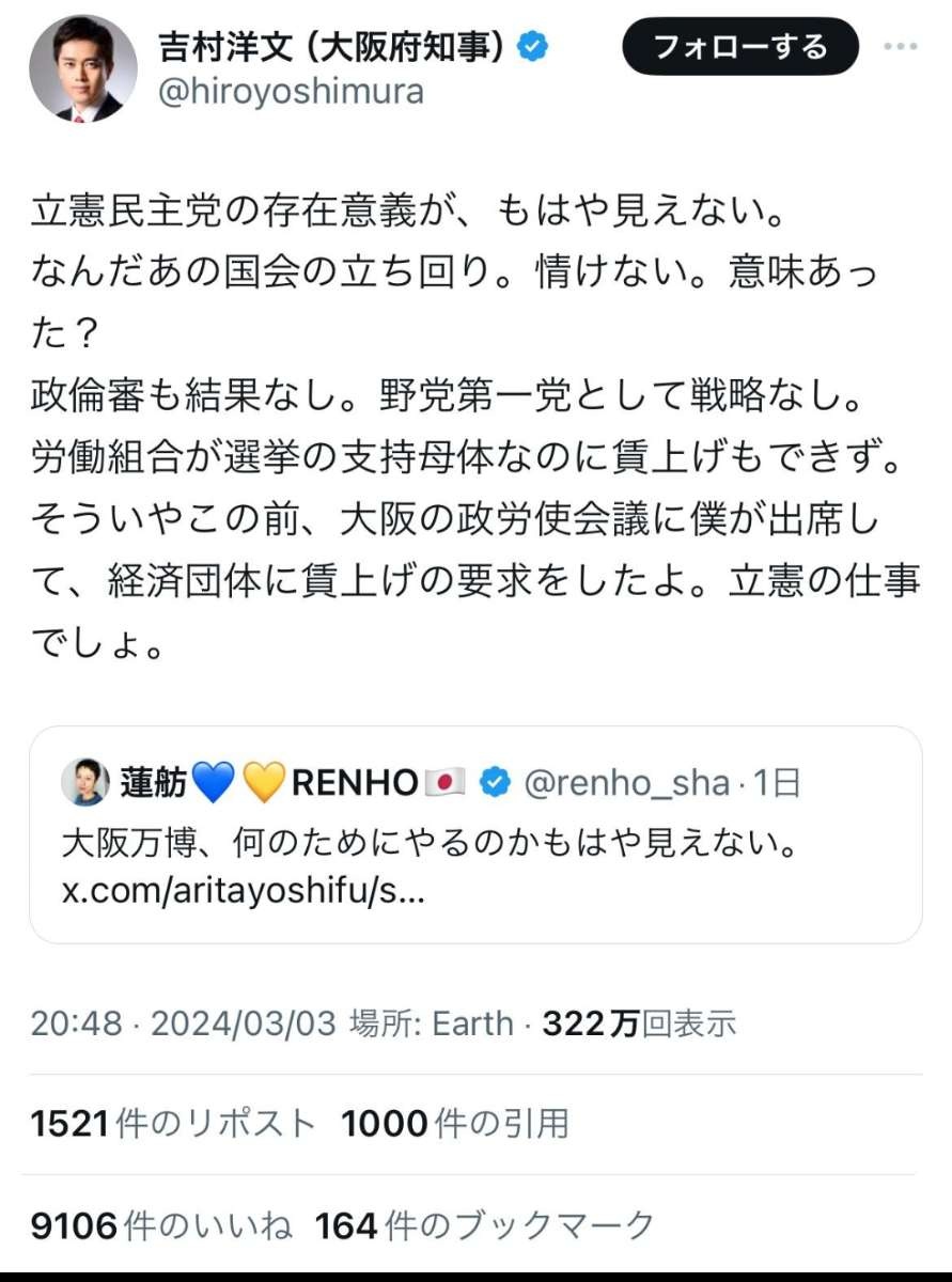 - 立憲がいかに無意味かを語るんじゃなくて万博が有益な事を語ろうや