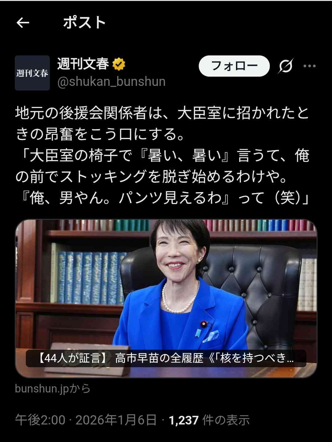 【文春砲】高市早苗、支持者を部屋に集め脱ぎ出していた