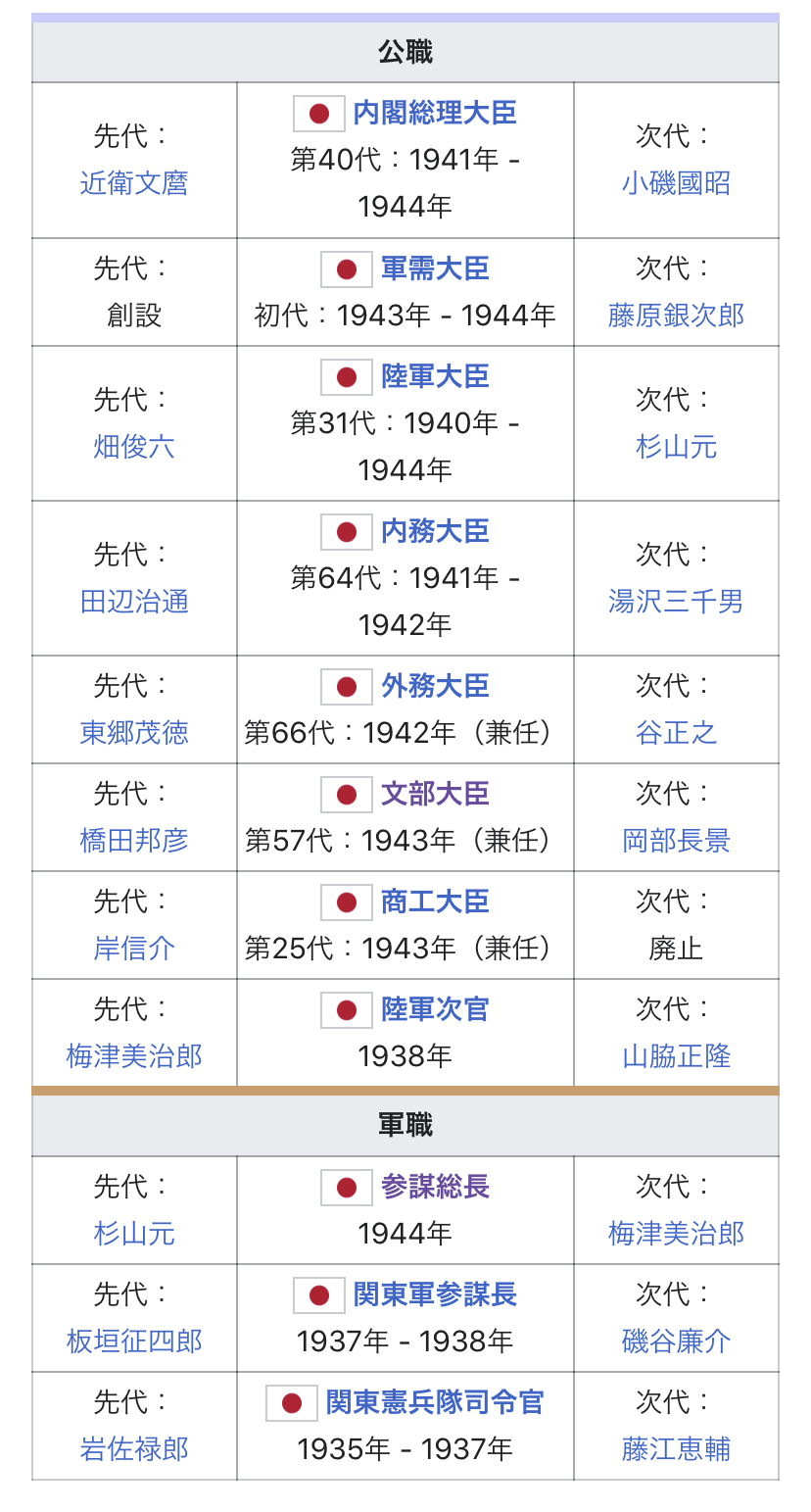 内務大臣、外務大臣、文部大臣、商工大臣、軍需大臣を歴任した。https://ja.m.wikipedia.org/wiki/%E6%9D%B1%E6%A2%9D%E8%8B%B1%E6%A9%9F