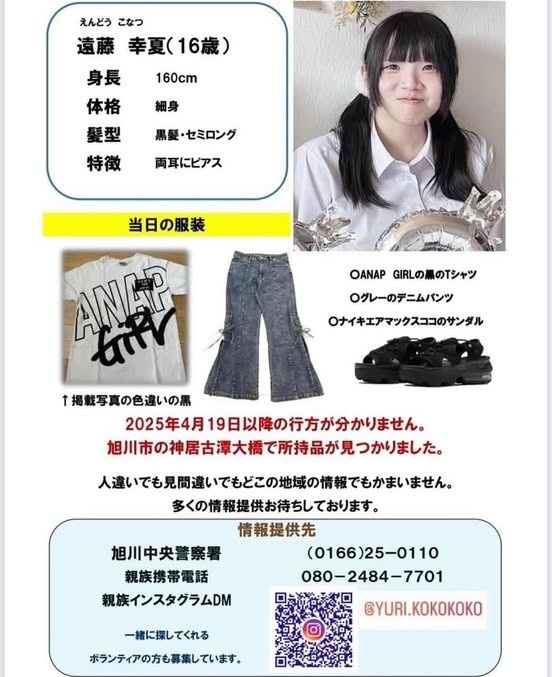 【旭川】4/19以降から行方不明の16歳少女、情報求む