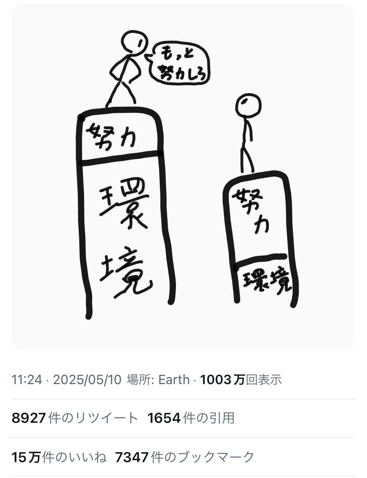 - いうほど良い環境で育ってきたやつがそうじゃない奴にお前は努力不足って言ってるところ見たことあるか?