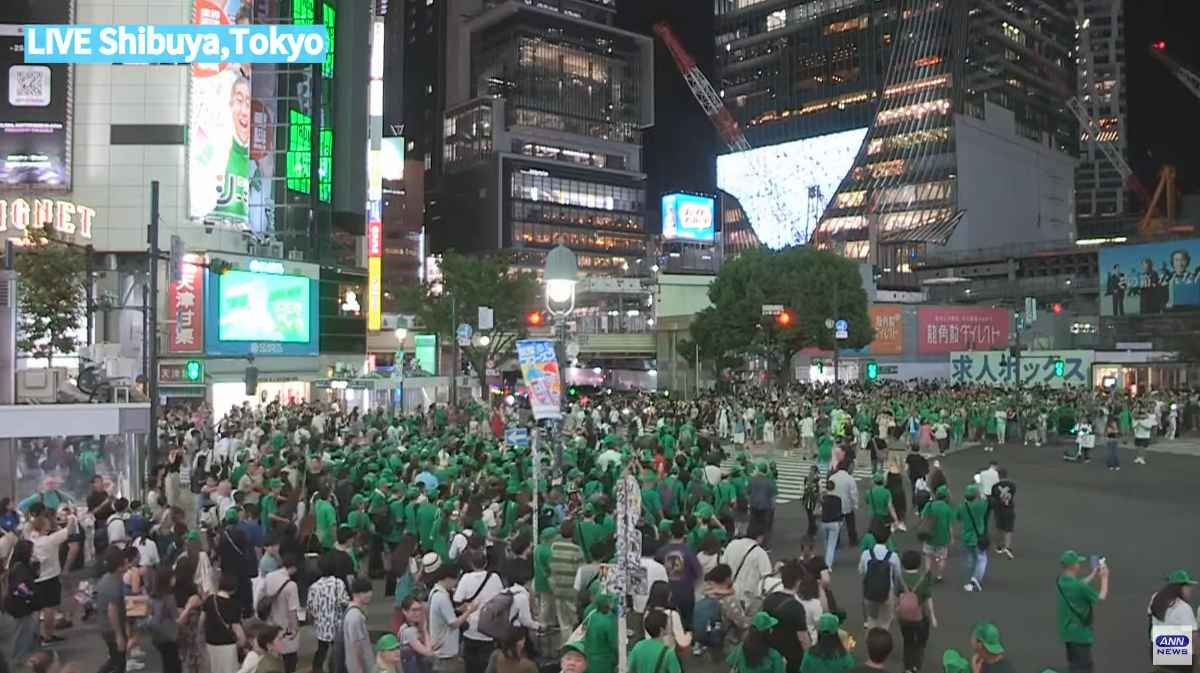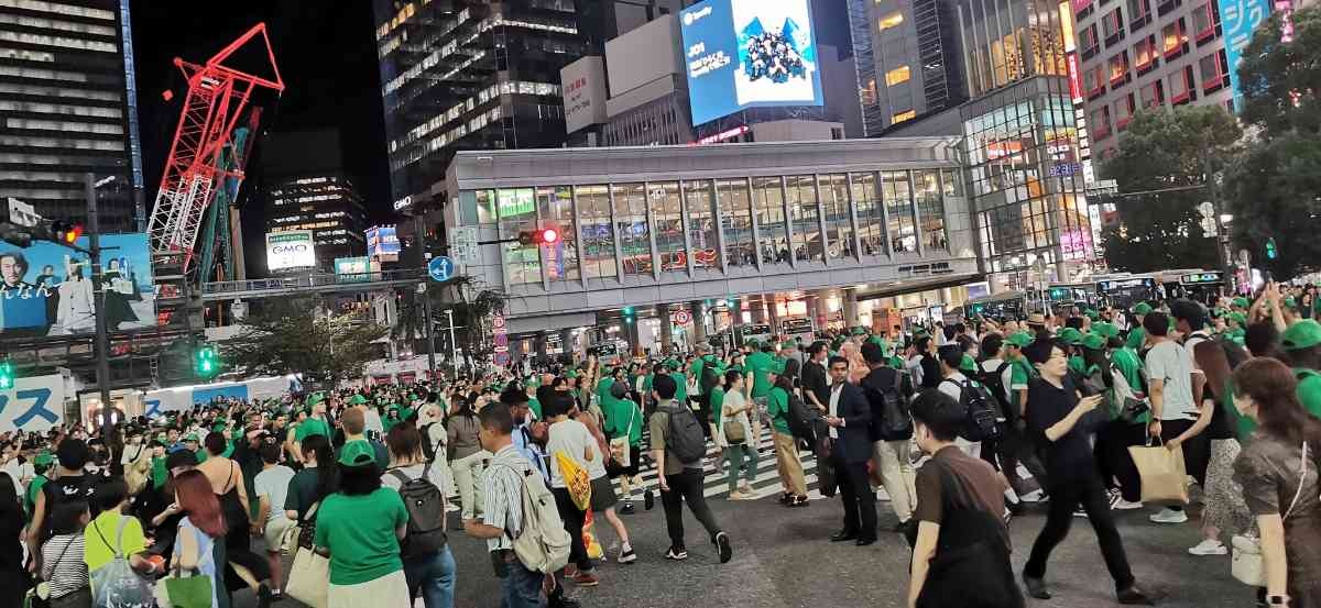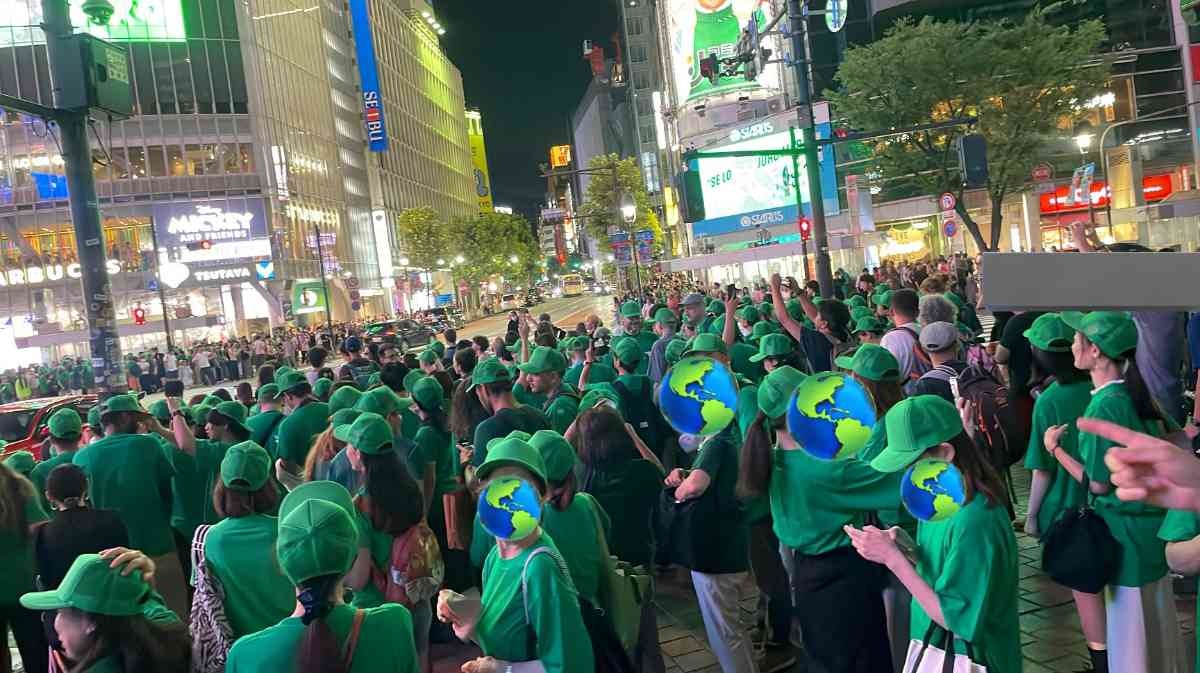 【画像】渋谷スクランブル交差点で多国籍老若男女の緑集団が現れる 詳細不明🟩