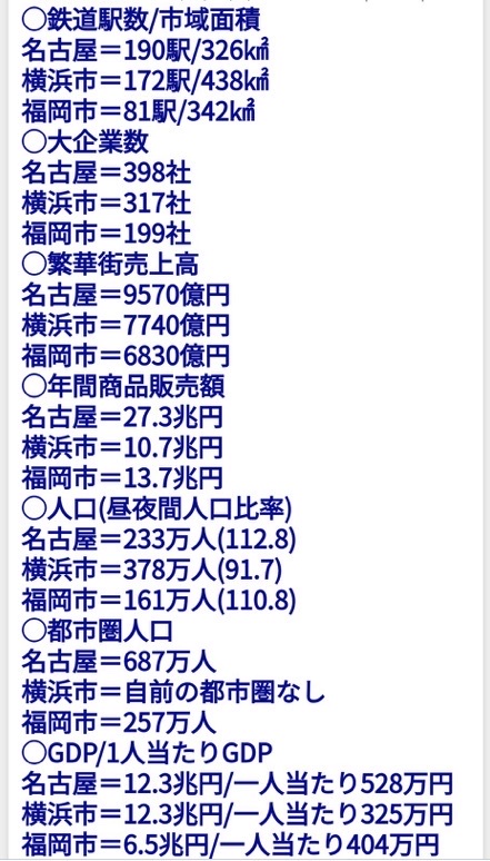 -うち地下鉄駅数 名古屋(85駅)>横浜(40駅)>福岡(36駅)