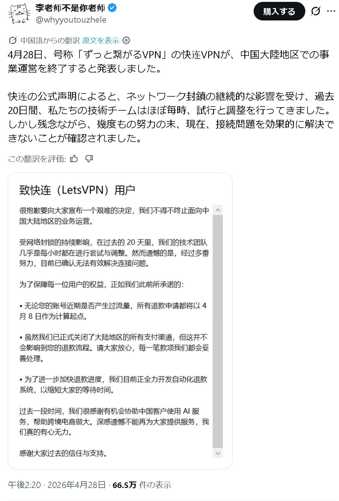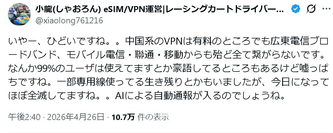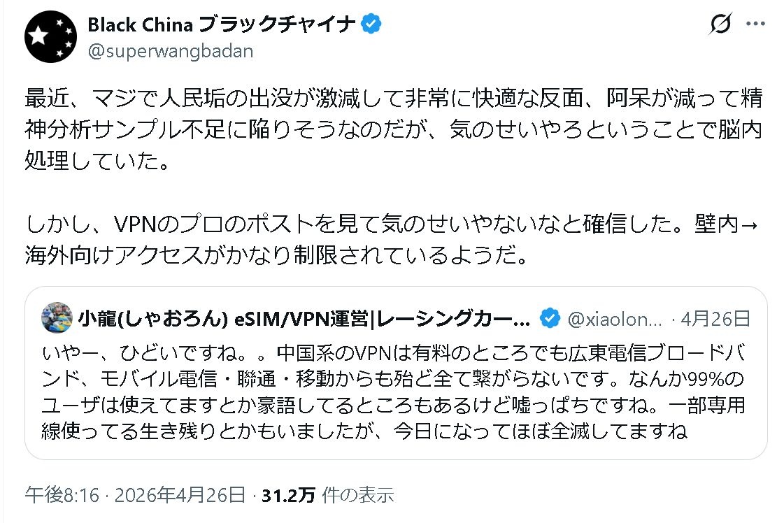 - 続々とVPN使いの中国人達がSNSから消えてる模様