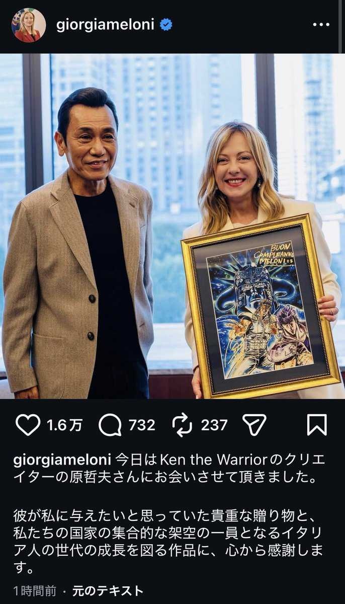 “アニメ好き”メローニ伊首相、漫画家・原哲夫と面会 『北斗の拳』ファンとして贈り物受け取る - 2 : 2026/01/17(土) 17:24:44.88 ID:GO77xETq0