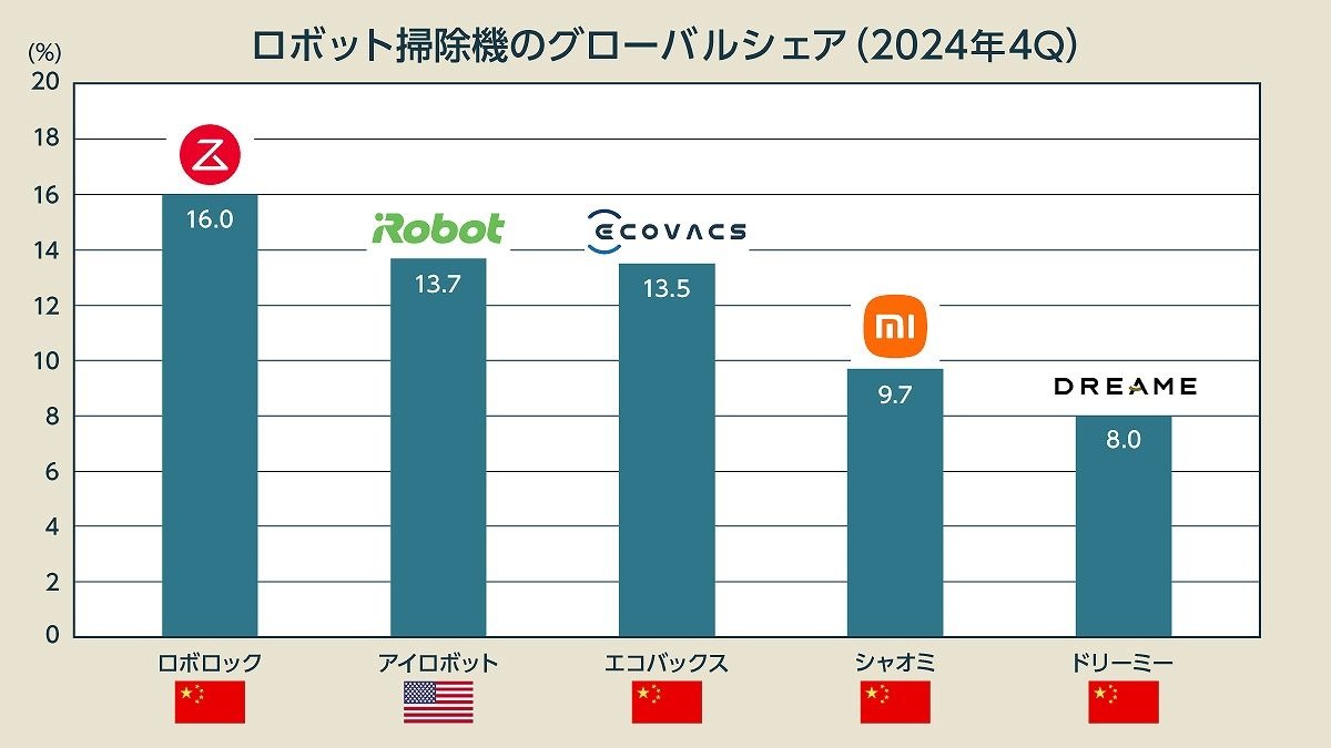 要因はさまざまなあるが、最も大きいのが中国メーカーの台頭だ。2024年第4四半期のグローバルシェアでは、中国企業のロボロック(Roborock)に抜かれ、アイロボットは2位に転落してしまった。1998年に中国・江蘇省で起業したエコバックス(Ecovacs)は当初フィリップスの製品などの受託生産をしていたが、2009年に自社開発のお掃除ロボット「DEEBOT」を発売したことが転機になった。これにロボロック、ドリーミー(Dreame)、スマホ大手のシャオミ(Xiaomi)などが続いた。
