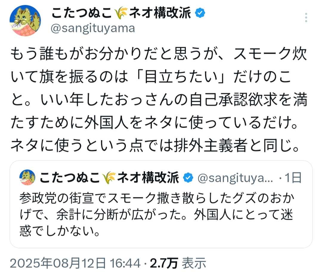 - アンチ参政党活動はガンガンやったほうがええけどやり方を考えないとな