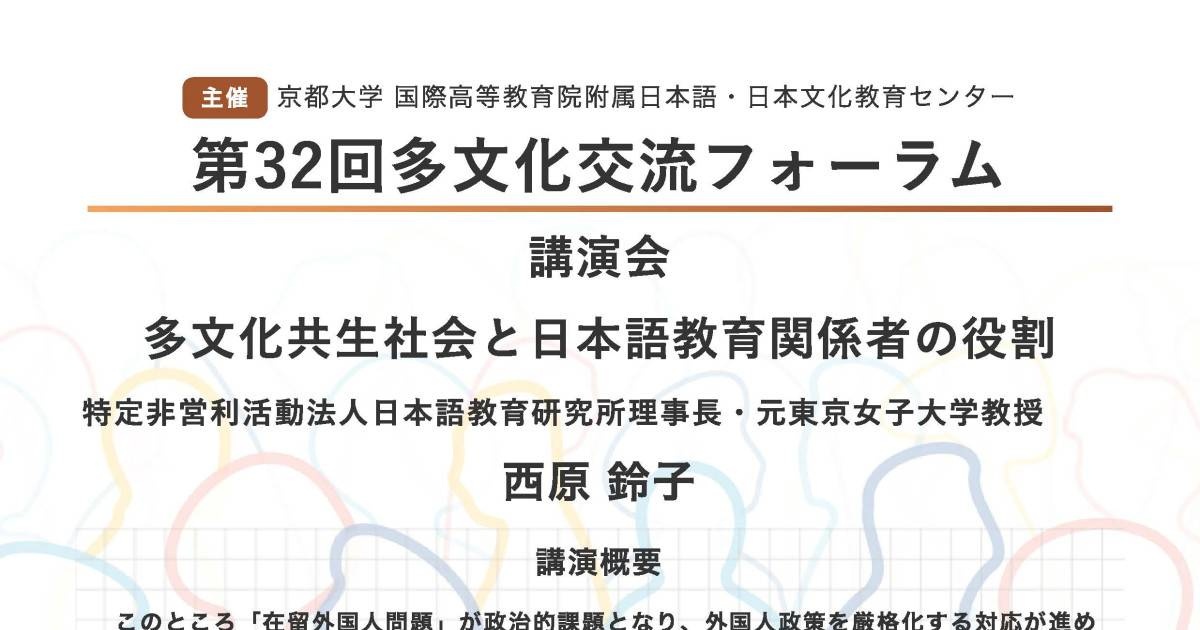 第32回多文化交流フォーラム「多文化共生社会と日本語教育関係者の役割」国際高等教育院附属日本語・日本文化教育センターでは、日本語や日本文化の研究に携わる方々を招き、多文化交流フォーラムを開催しています。 32回目の今回は、西原鈴子 特定非営利活動法人日本語教育研究所理事長(元東京女子大学教授)をお迎えして、「多文化共生社会と日本語教育関係者の役割」という題目で講演会を行います。 多文化共...www.kyoto-u.ac.jp - 28 : 2026/01/08(木) 06:55:00.86 ID:nt5DF4L70