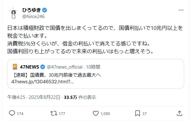 ひろゆき「日本は積極財政で国債を出しまくり、国債利払いで10兆円以上を税金で払う、消費税5%分借金の利払いで消える