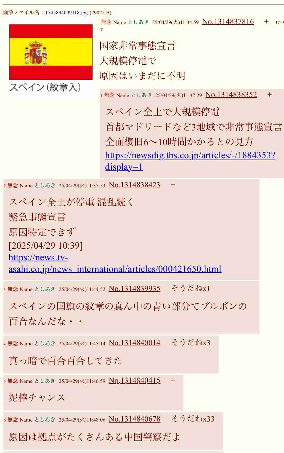 ふたば民「スペインで大規模停電?…中国人によるテロだな」