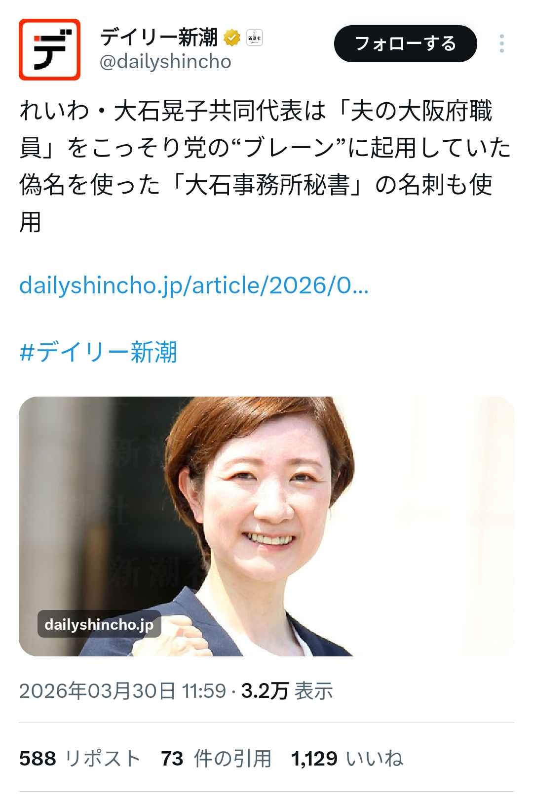 れいわ大石あきこ代表、夫である大阪府職員を偽名で秘書にしていた