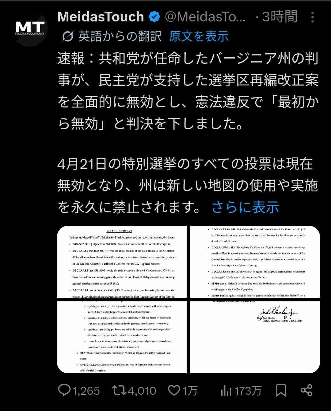 バージニアで選挙した結果、中間選挙でトランプの票が少なくなる事が確定