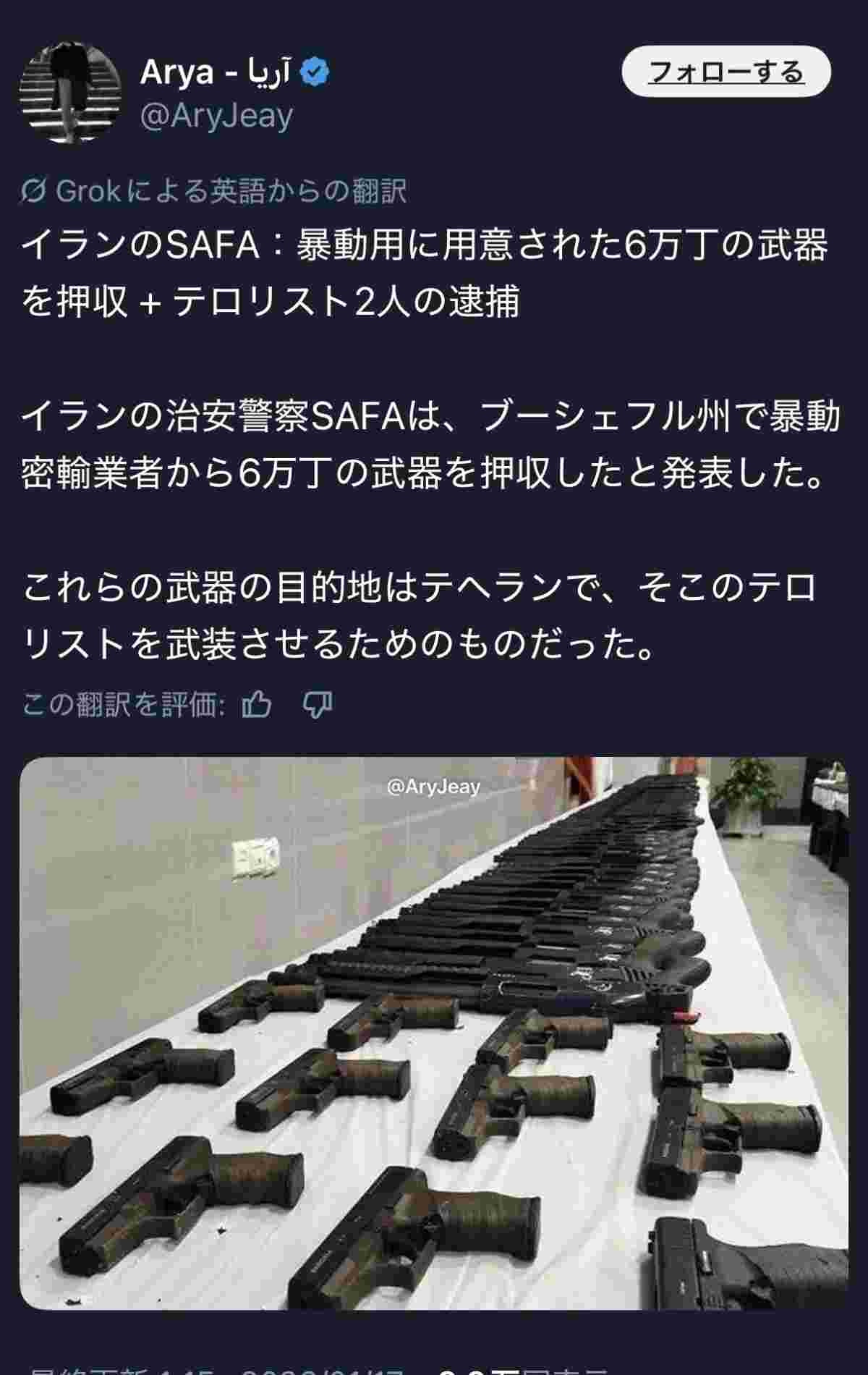 イランの平和的デモもう無茶苦茶、デモ隊が保有していた6万丁の西側製銃火器やら斬首用マチェットなど次々押収されまくるwww