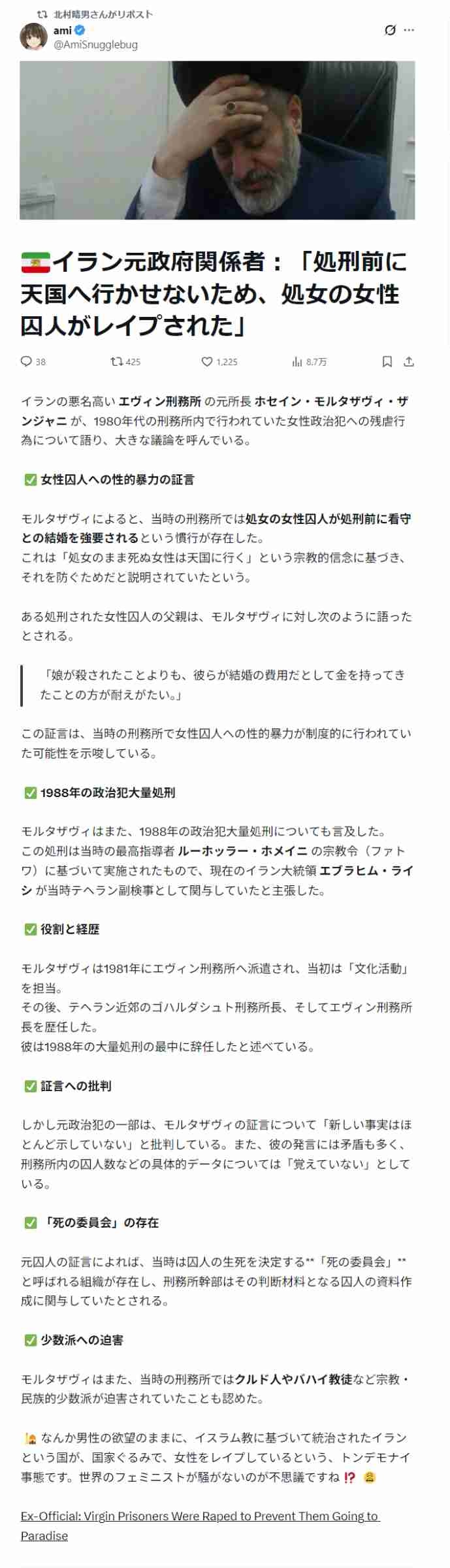 イラン元政府関係者「処刑前に天国へ行かせないため、処女の女性囚人をレ●プ」