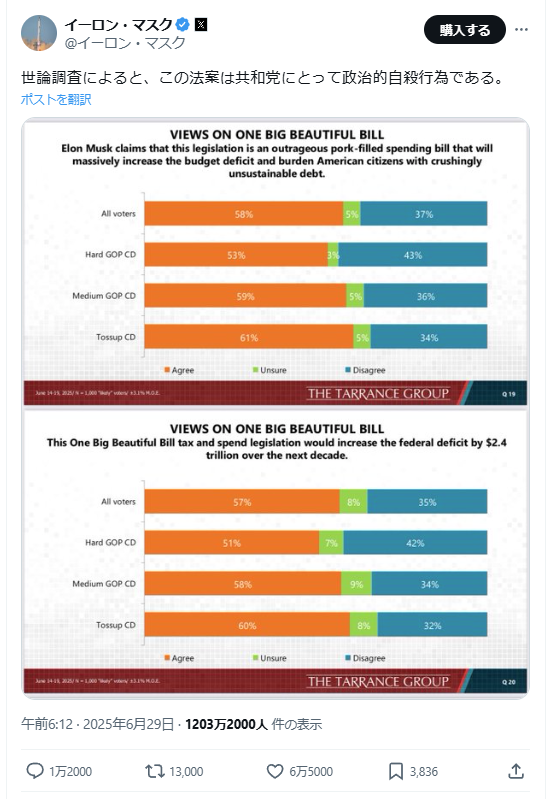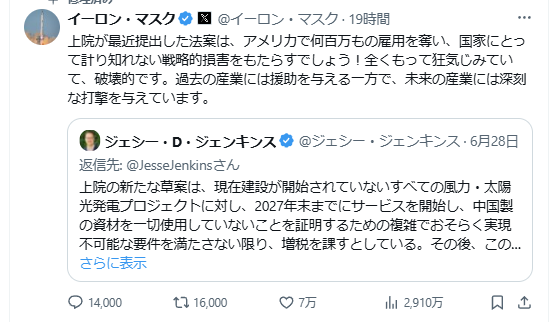 イーロンマスク「トランプ減税法案はとんでもない無駄遣い、赤字を拡大し、アメリカ国民に持続不可能な債務の重荷を負わせる」