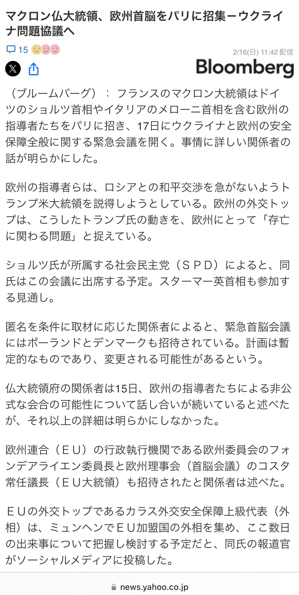 > フランスのマクロン大統領はドイツのショルツ首相やイタリアのメローニ首相を含む欧州の指導者たちをパリに招き、17日にウクライナと欧州の安全保障全般に関する緊急会議を開く。