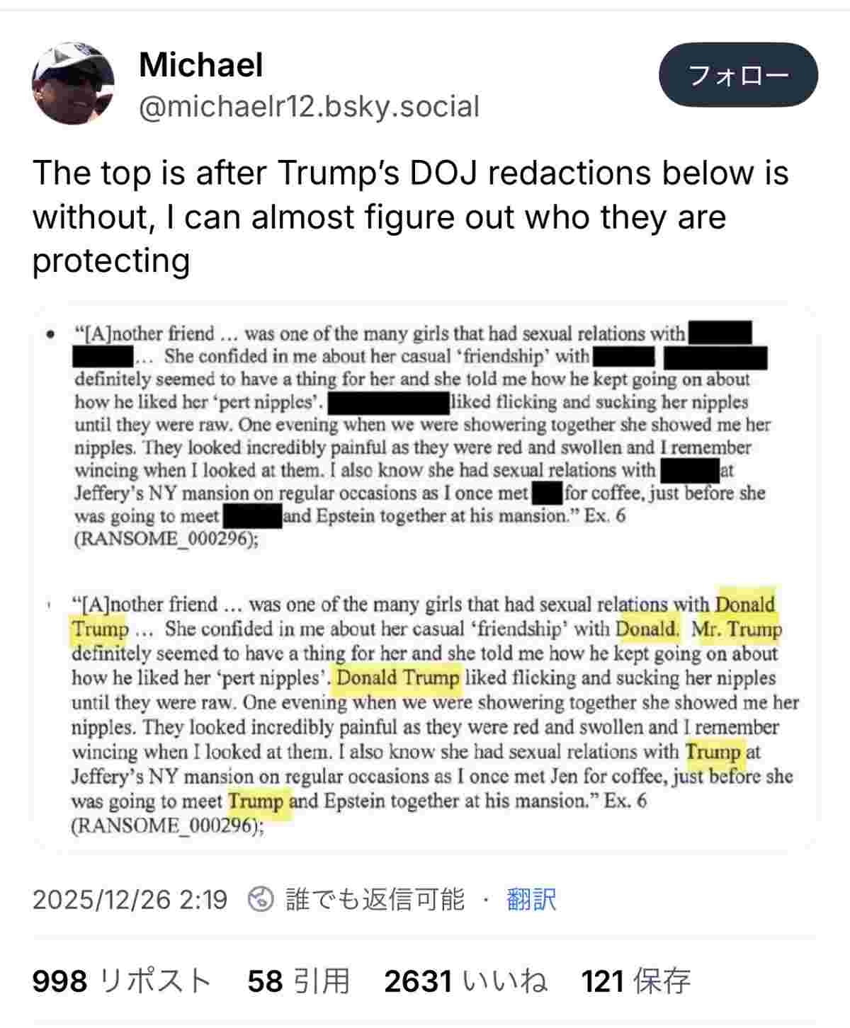 エプスタイン文書、コピペで黒塗りが剥がせるため「ドナルド・トランプ」がピンポイントで黒塗りされているとバレてしまう