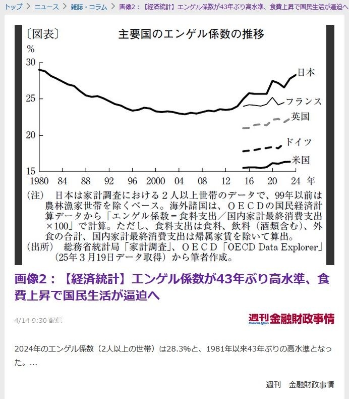 それエンゲル係数を悪化させる要因だからなw - 140 : 2025/09/26(金) 16:24:52.45 ID:RCW3Sc3n0
