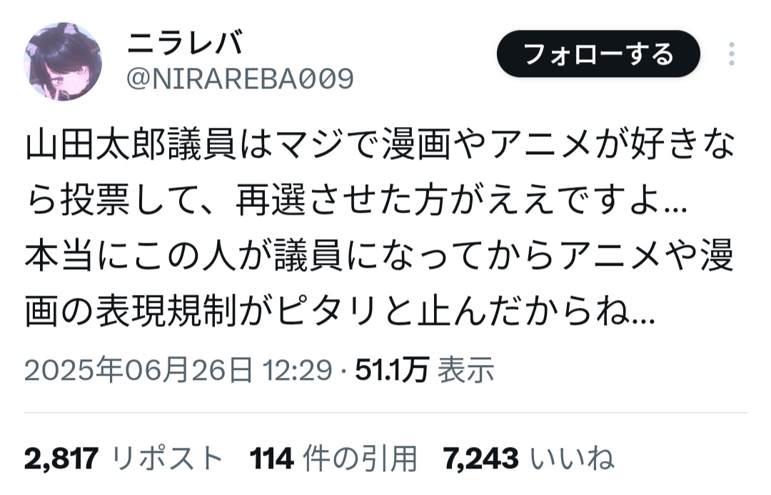 オタク「山田太郎が議員になってから、アニメや漫画の表現規制がピタリと止んだ」→こういう投稿が普通に叩かれるようになる