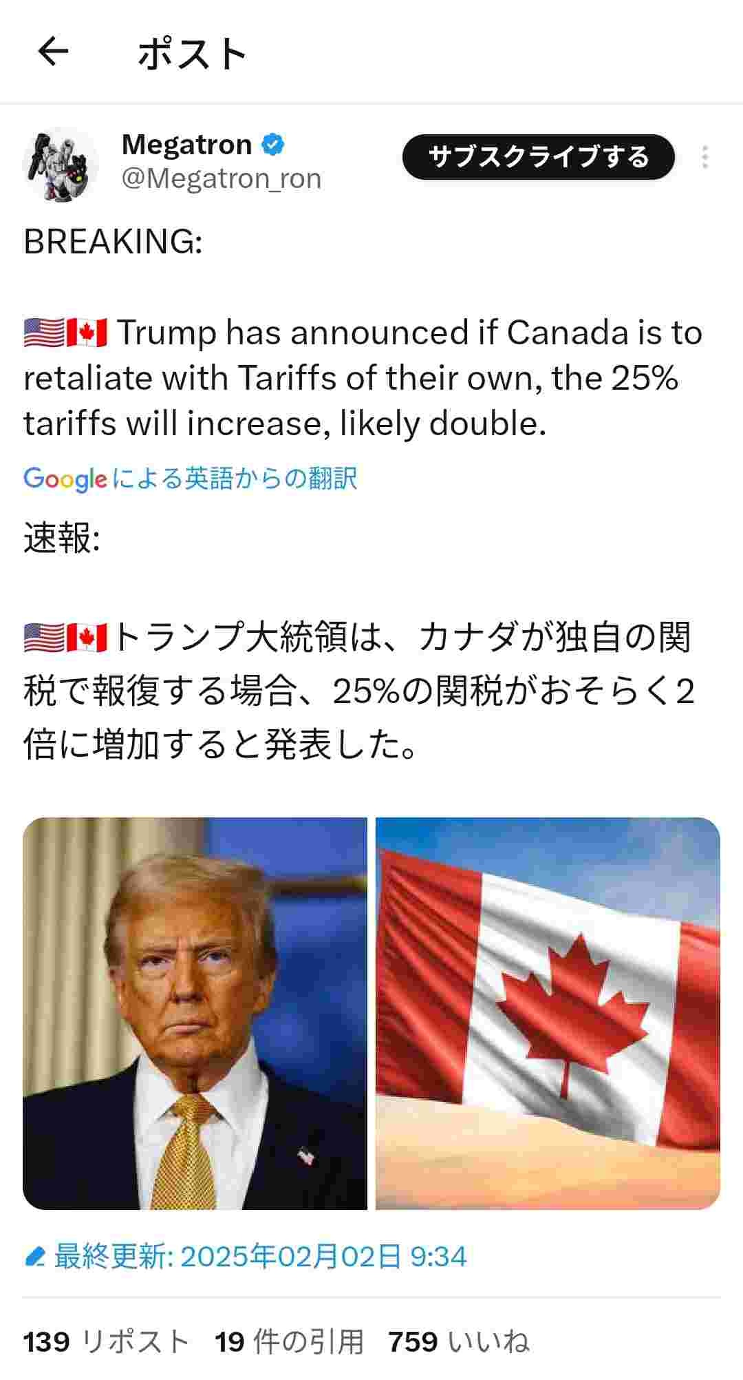 - カナダみたいな兄弟国と言ってもいい同盟国に関税で圧力かけるとかトランプ狂ってるわ