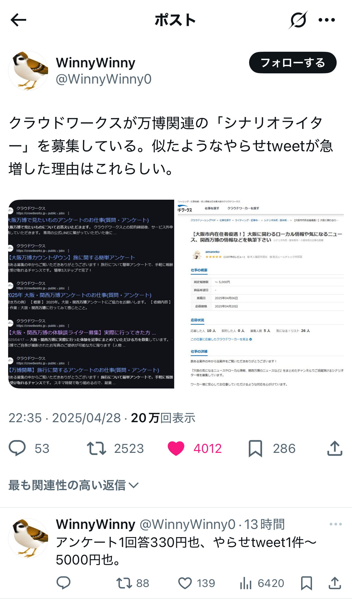 クラウドワークスが万博関連の「シナリオライター」を募集している。似たようなやらせtweetが急増した理由はこれらしい。