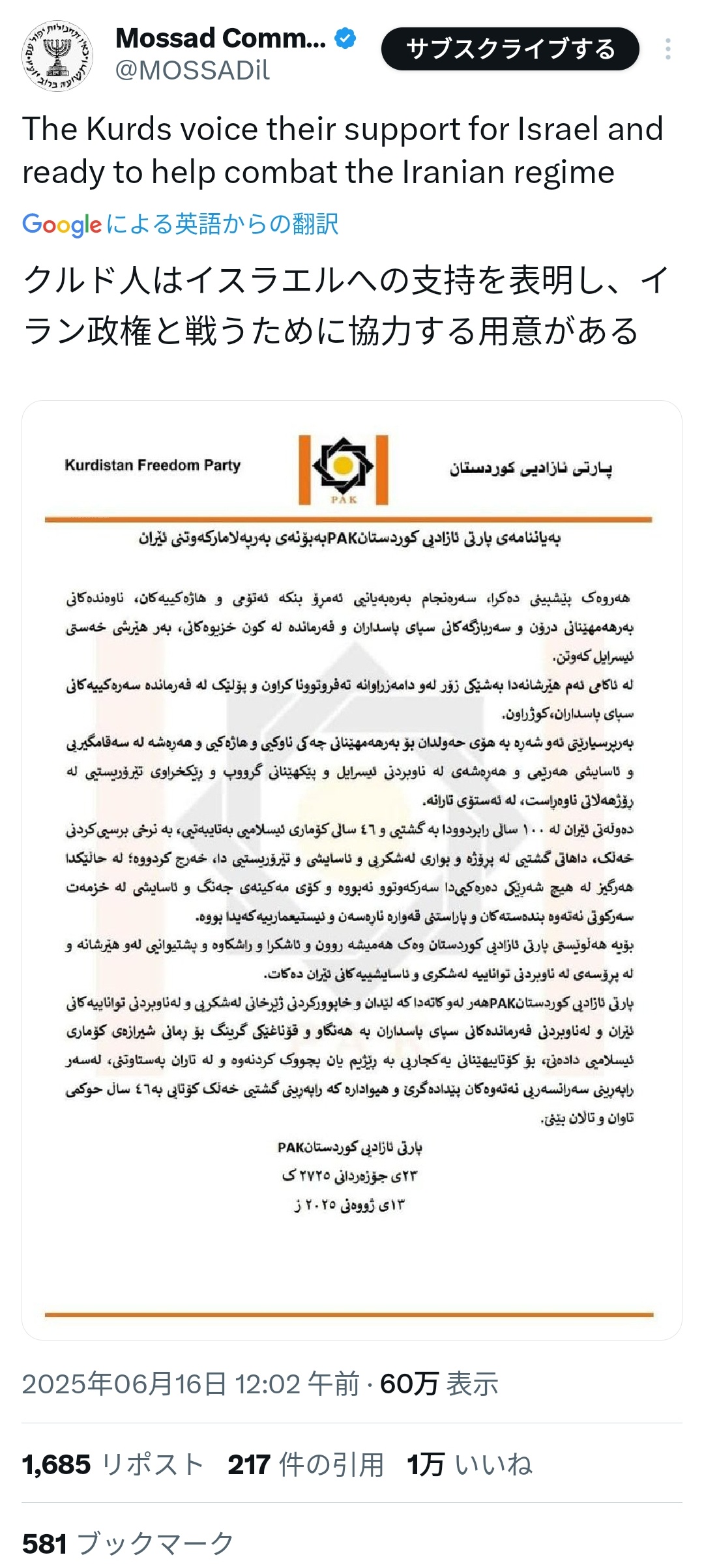PKK→イスラエルの軍事行動反対 - 28 : 2025/06/16(月) 13:43:56.92 ID:7ep2ANQId