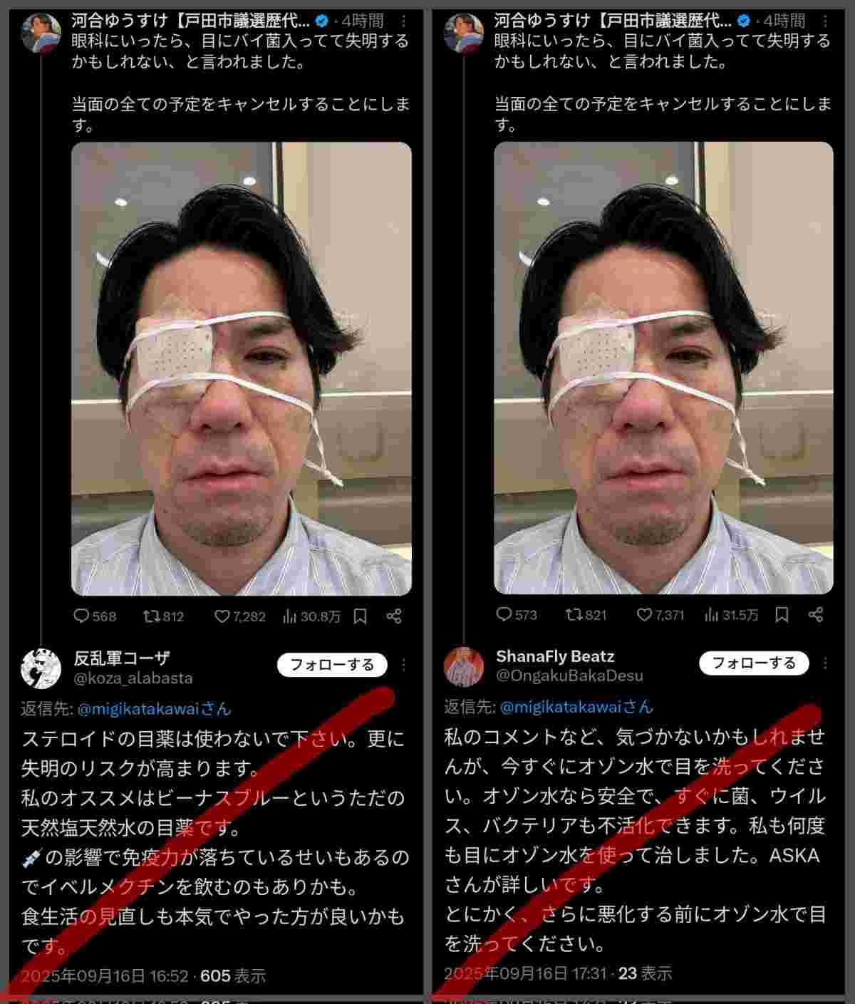 河合氏は2日経過した18日に再度、サブアカウントに投稿。「だんだん回復してきたぞ。眼科に行ったら、化膿さえしなければ失明はしない、と言われた!!」と記し、「20日19時の北戸田駅の街宣行きたいなぁ」と活動再開への意欲を見せた。