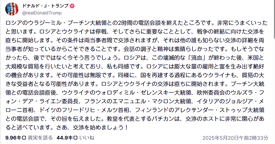 トランプ「たった今、プーチンと素晴らしい電話会談、ウクライナとの即時停戦交渉へ!誰もできなかったことを私はやった!」