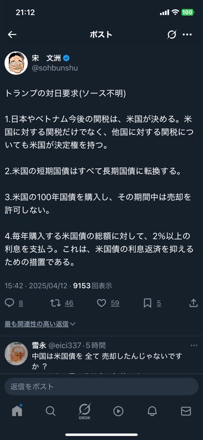トランプ「日本への要求は4つ。関税は米国が決める。米100年国債購入。売却不可。国債総額の2%支払い」