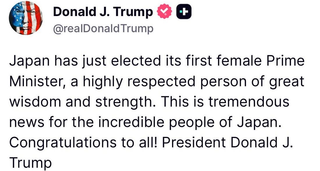 【ワシントン=坂口幸裕】トランプ米大統領は6日、自身のSNSに自民党新総裁に就いた高市早苗氏について「非常に尊敬される人物で、深い知恵と強さを備えている」と評価した。「偉大な日本国民にとって素晴らしいニュースだ。皆さんおめでとうございます!」と書き込んだ。