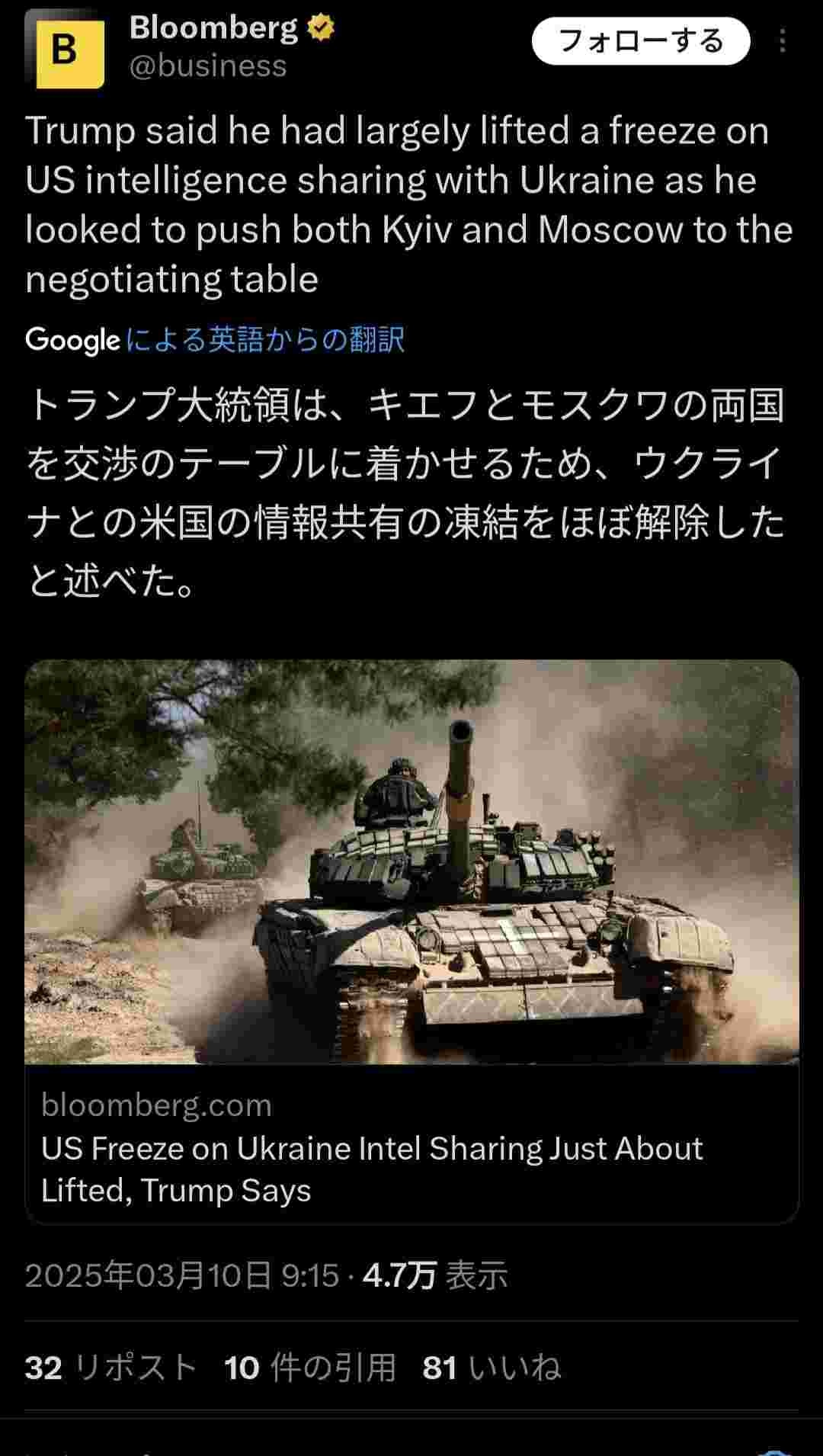 🇺🇸トランプ大統領、ウクライナ軍への情報共有の中止を中止