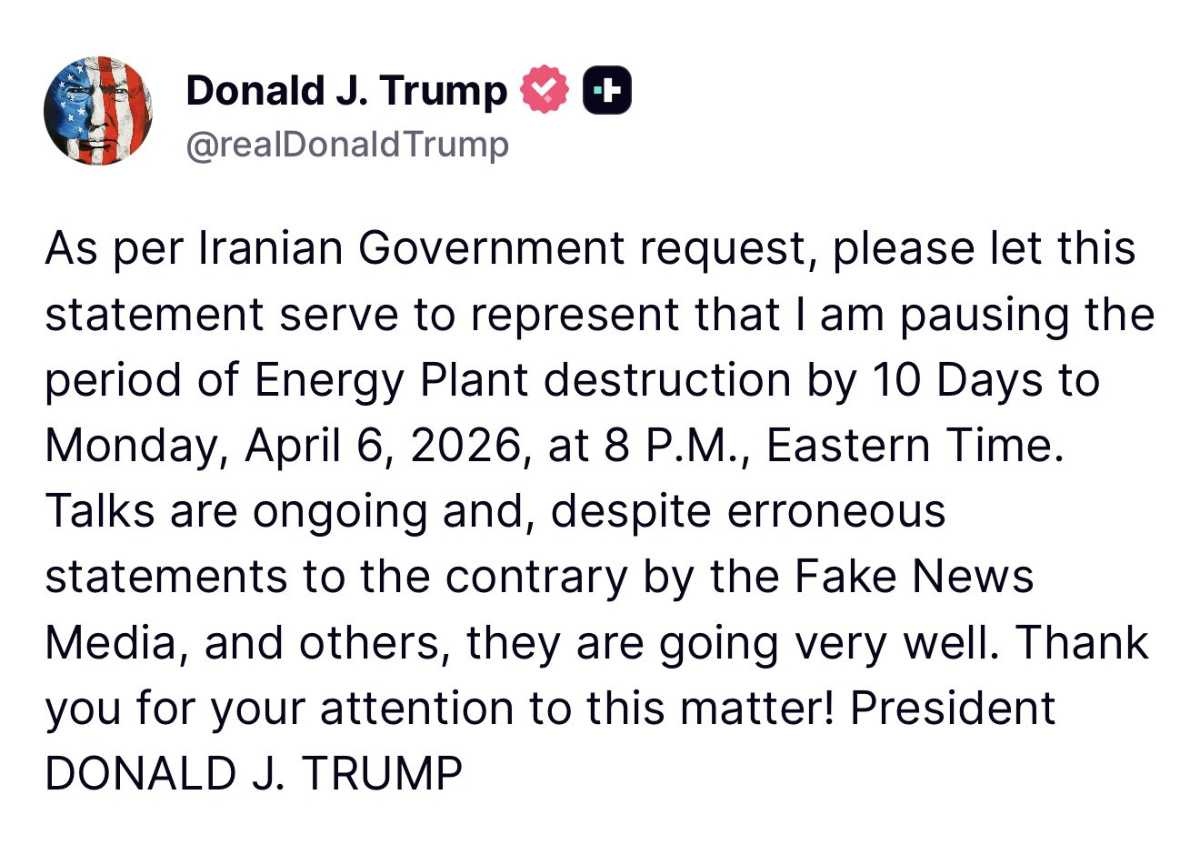 - イラン政府の要請に従い、この声明をもって、エネルギー施設破壊の期間を10日間休止し、2026年4月6日(月)東部標準時午後8時まで延期することを表明します。