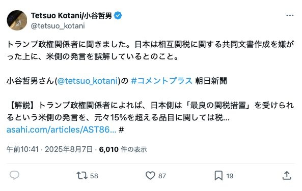最初から「話が違う」って方向に持って行くために合意文書を作らなかったわけ - 4 : 2025/08/07(木) 11:13:29.32 ID:zxraWu3e0